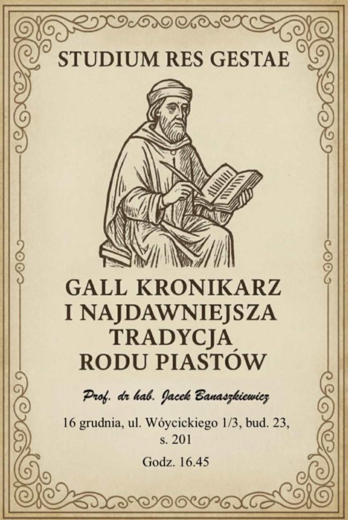 Zapraszamy na wykład prof. dra hab. Jacka Banaszkiewicza Gall Kronikarz i najdawniejsza tradycja rodu Piastów, który odbędzie się w ramach Studium Res Gestae.